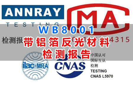 WB8001 帶鋁箔反光材料檢測報告,依據 GB/T 26572-2011,檢測項目包括重金屬與阻燃劑含量。檢測環境為特定溫濕度。結果顯示重金屬及阻燃劑含量,結論表明該WB8001帶鋁箔反光材料檢測結果是否符合標準。